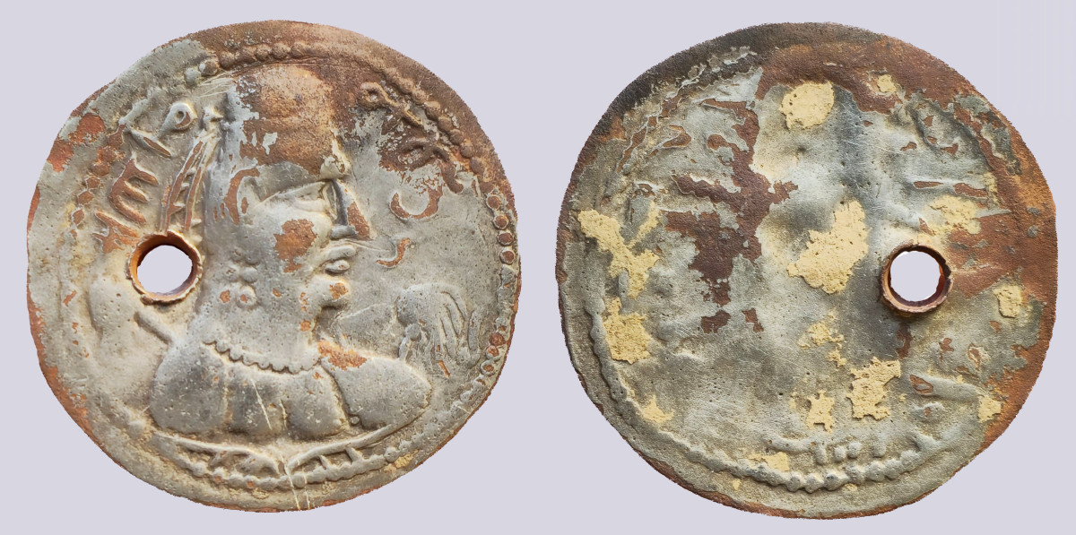 Pierced, some areas of silver coating missing. Otherwise choice XF. RARE
