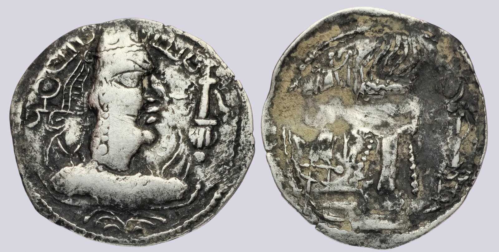 OBVERSE: Bust in profile view right, mustache; wearing a diadem with two crescents with an upright stroke inside of each; two ribbons hang from the diadem. Tips of a crescent moon appear at the shoulders. Beneath the bust a winged/vegetal element. In the left field: Alkhan tamga (S 1) In the right field: Club (S 39). Brahmi: 10″ (r.o.) sa (sometimes ba, sometimes a second aksara like ya) 12″ (r.o.) bapa or paba (bapa could mean “father, or most likely a short version of Mepama)