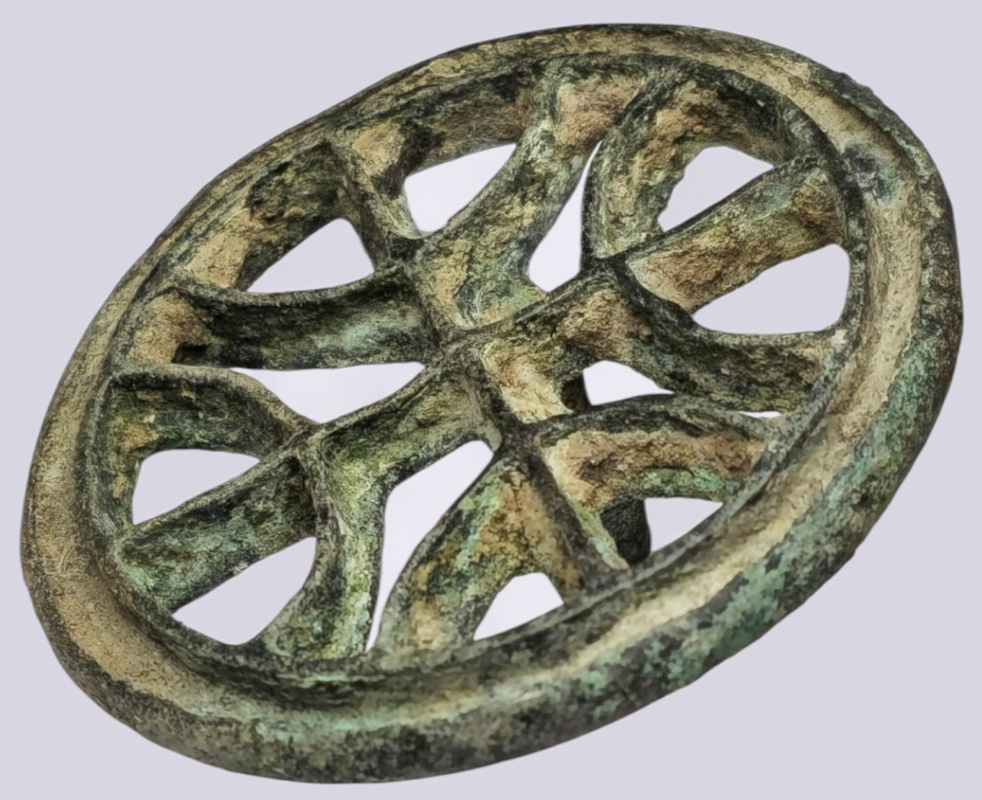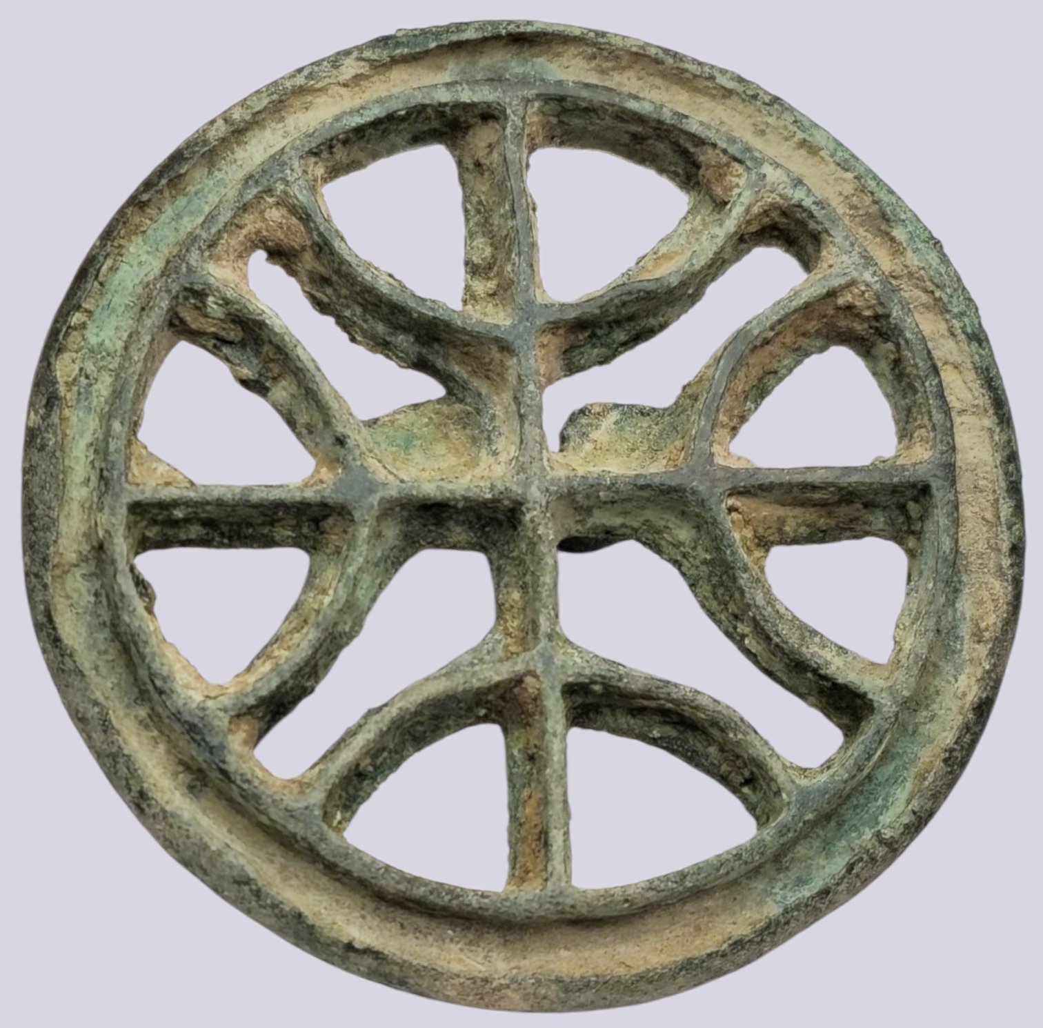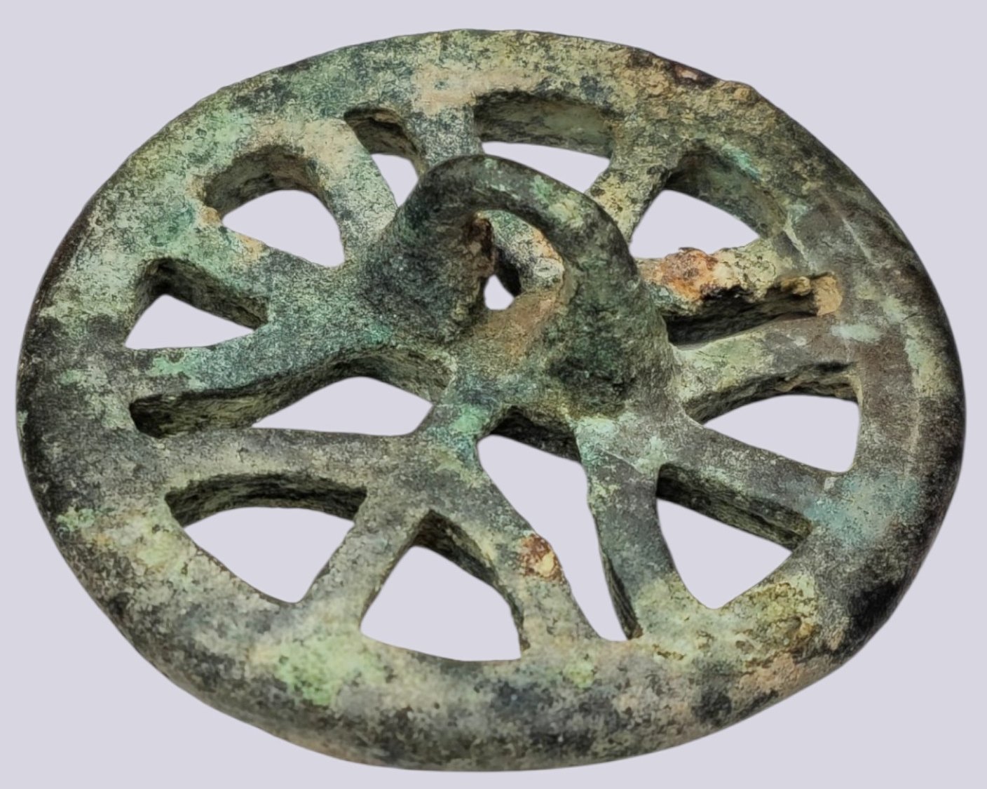 Excellent ancient patina with clear openwork detailing and intact loop. Minor earthen deposits in crevices. Exceptional preservation for an artifact of this period