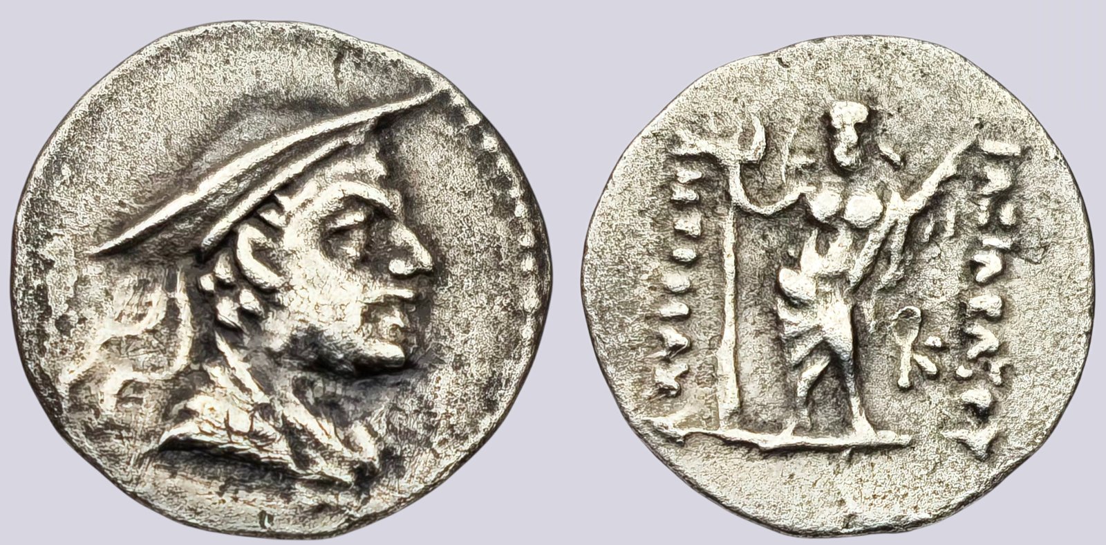 King of the Greco-Bactrian Kingdom, Antimachos I ruled during a period of expansion and artistic refinement. His coinage is known for its high-quality Hellenistic portraiture and the distinctive epithet ΘΕΟΣ (“Theos” – the God), one of the earliest instances of a Hellenistic ruler formally adopting a divine title on coinage