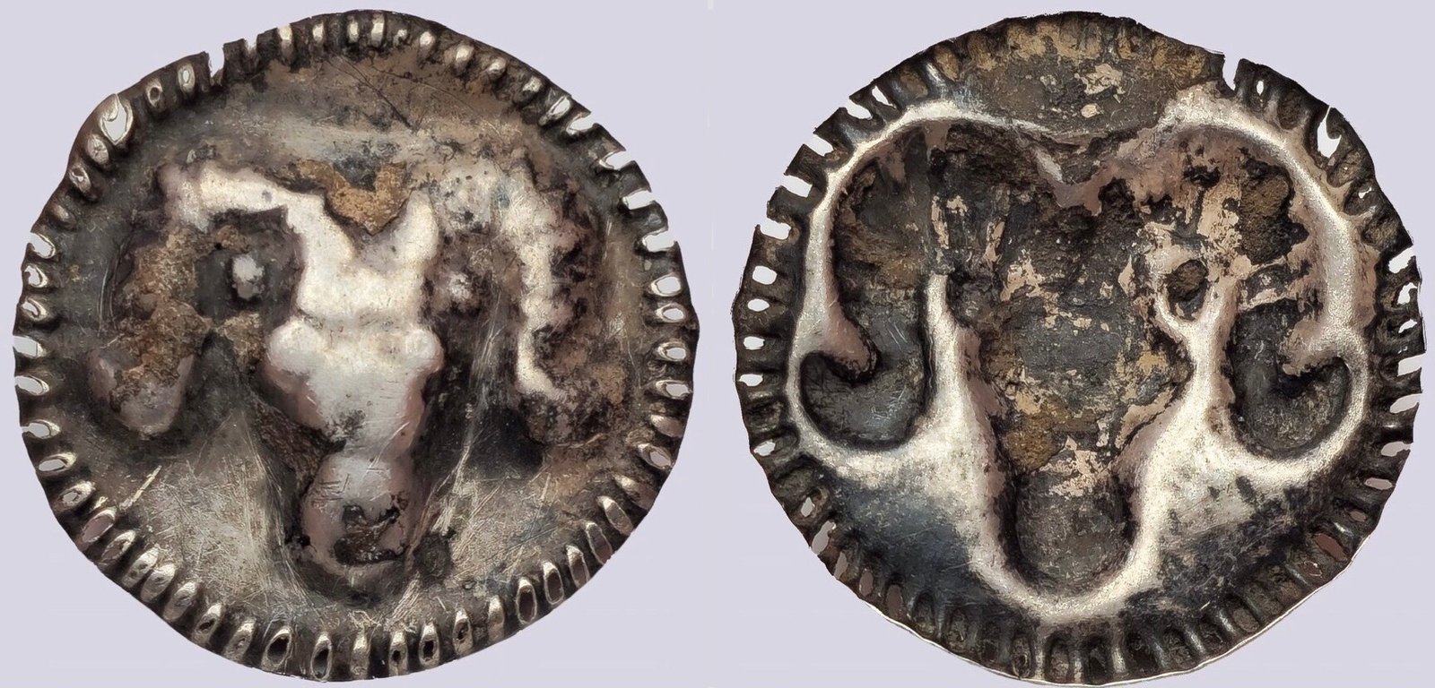 - The design is abstract, possibly representing a local adaptation of Sasanian or Kushano-Sasanian portraiture