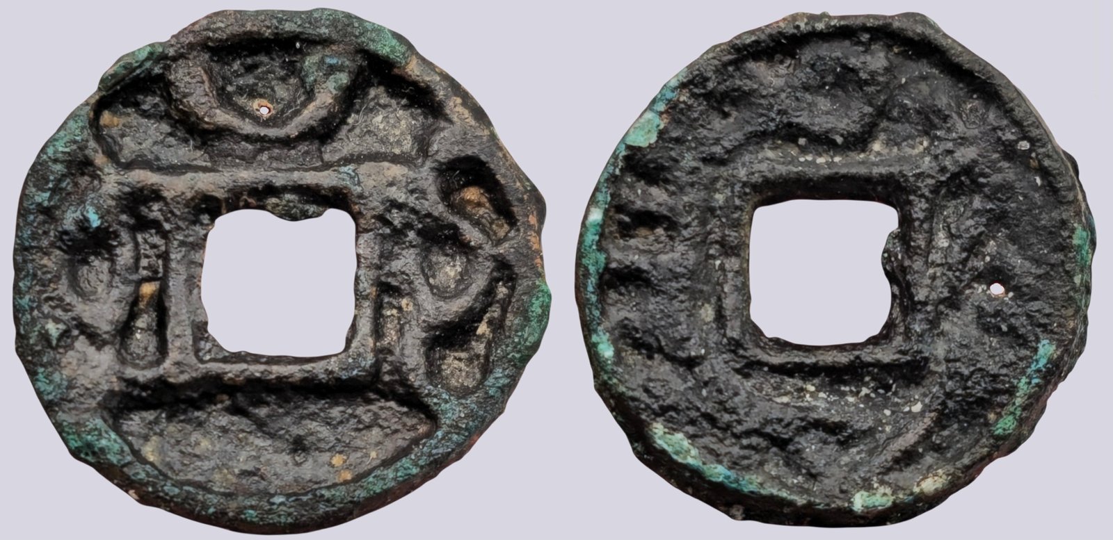 OBVERSE: The Y-shaped tamgha of Samarqand and two other symbols on the sides of the square hole