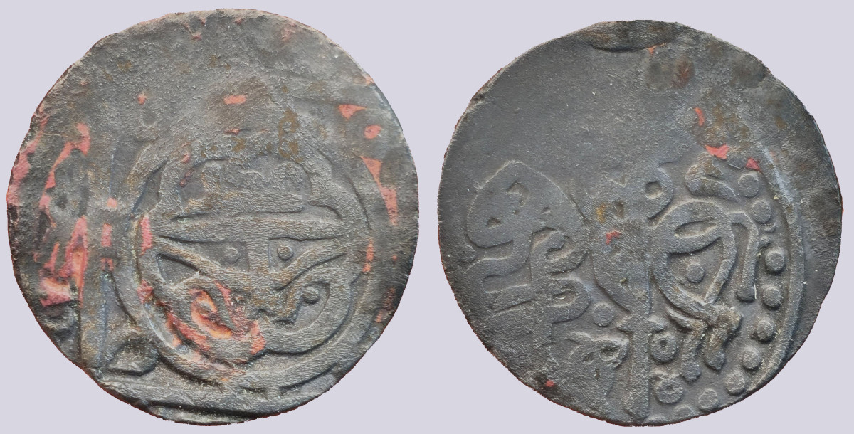 OBVERSE: “Adl” (The Justice) above “bow” tamgha, all within ornate frame, mint formula in outer voids