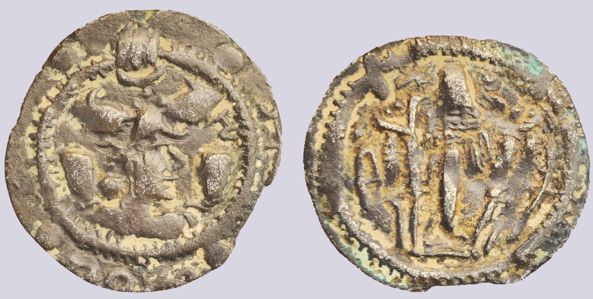 OBVERSE: Crowned bust after Sasanian model of Peroz I (457–484AD), right Tamga. Unclear Bactrian inscription; four balls on the edge