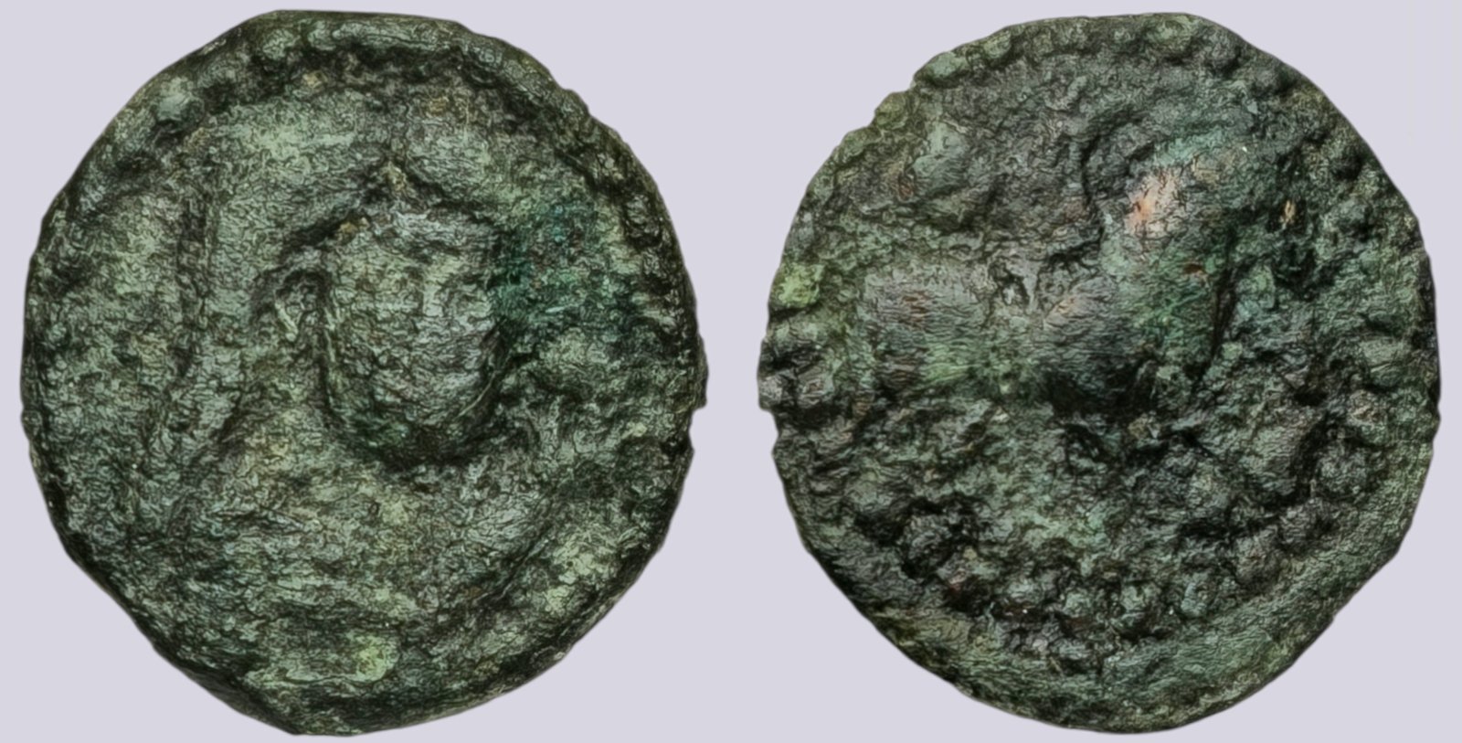 Crude cast. VF. Deep malachite patina. RARE