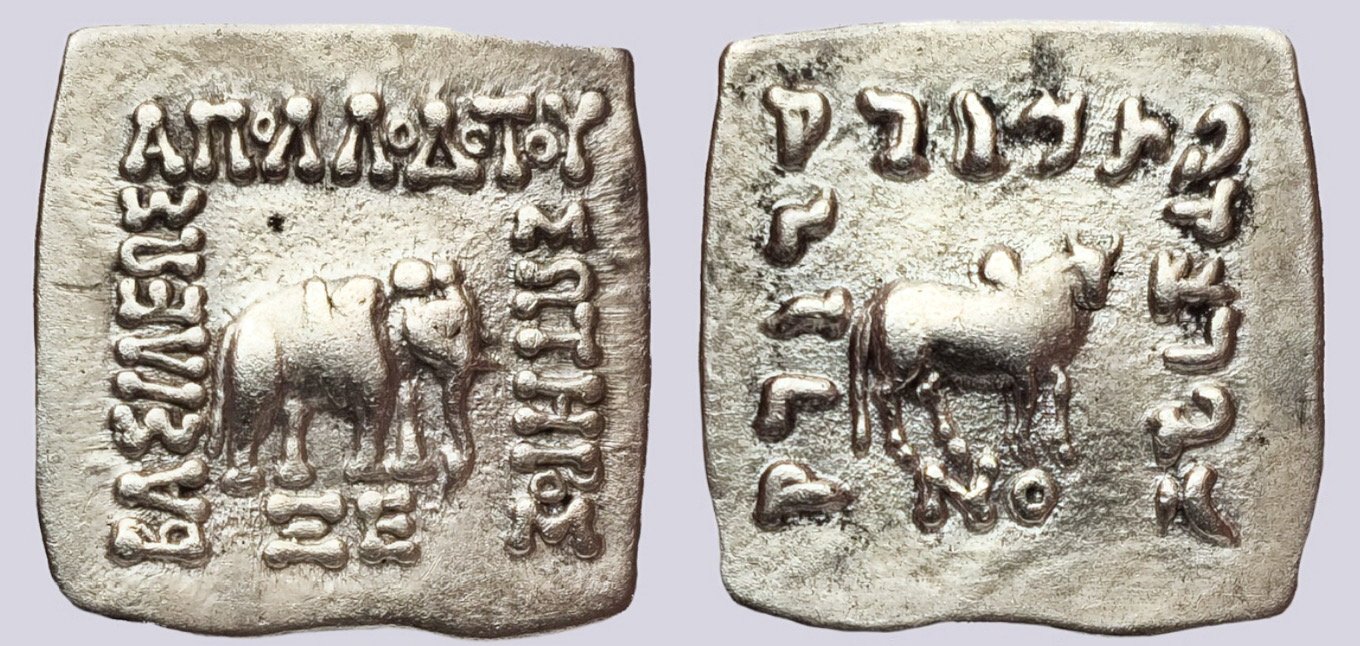 OBVERSE: Greek legend ΒΑΣΙΛΕΩΣ ΣΩΤΗΡΟΣ ΑΠΟΛΛΟΔΟΤΟΥ (King Apollodotus Saviour). Elephant, wearing string of bells, standing right, mint mark of Pushkalavati workshops under the Elephant