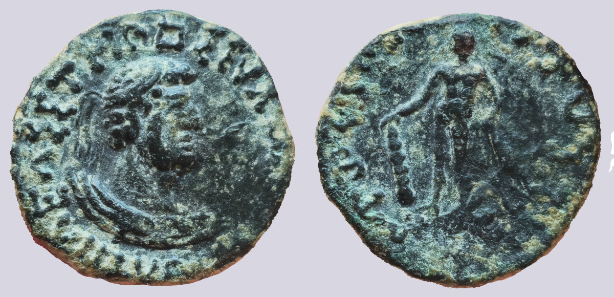 Heavy and big coin. Choice VF. Deep dark patina. Nice Roman style, laureate bust. RARE variety of portrait