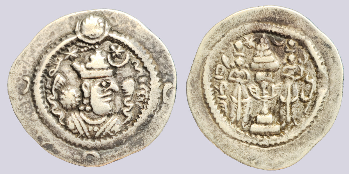 REVERSE: Fire-altar of Ahuramazda flanked by two attendants, regnal year and mint in Pahlavi