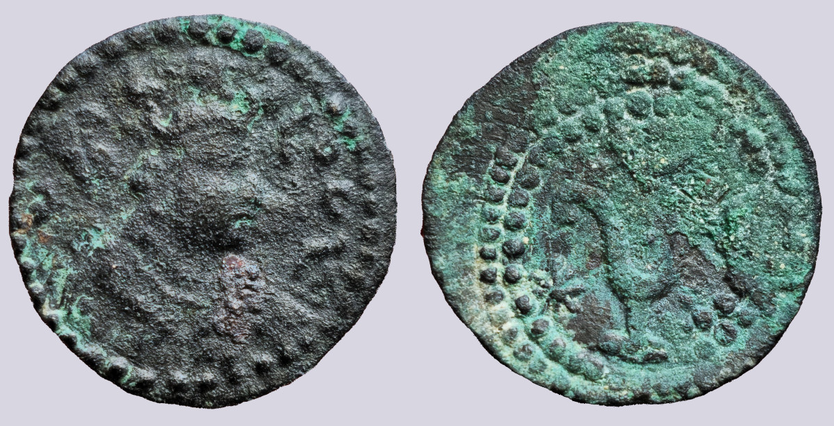 OBVERSE: Bust with elongated skull to right, wearing diadem and winged crown with bull’s head, earrings and pearl necklace with two ribbons; below, winged ornament; to right, uncertain legend in Baktrian