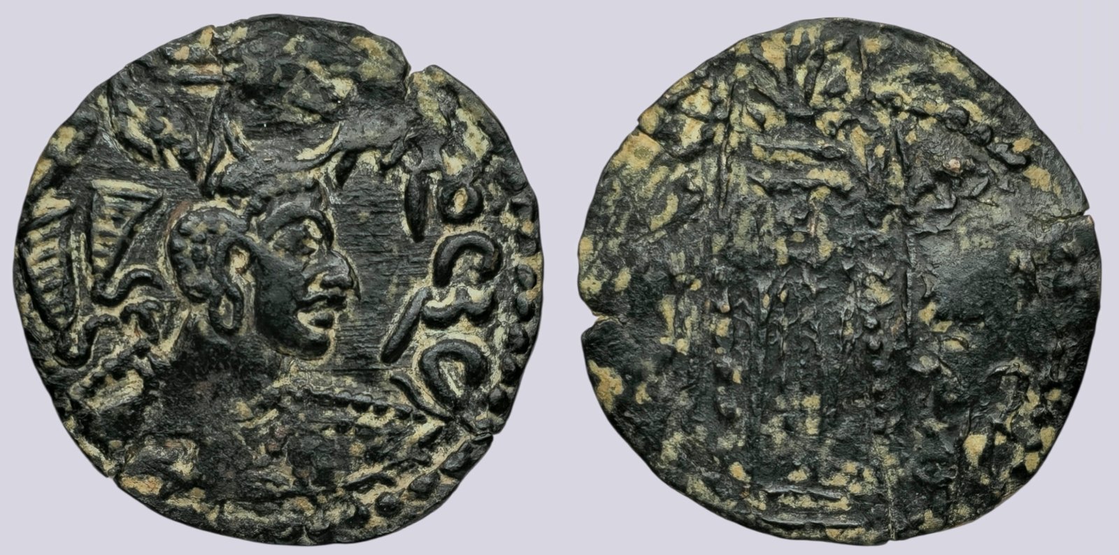 REVERSE: Fire altar, two attendants, wheels above their heads. Brahmi “la” in the left field. In the right field Kharoshti “hi”