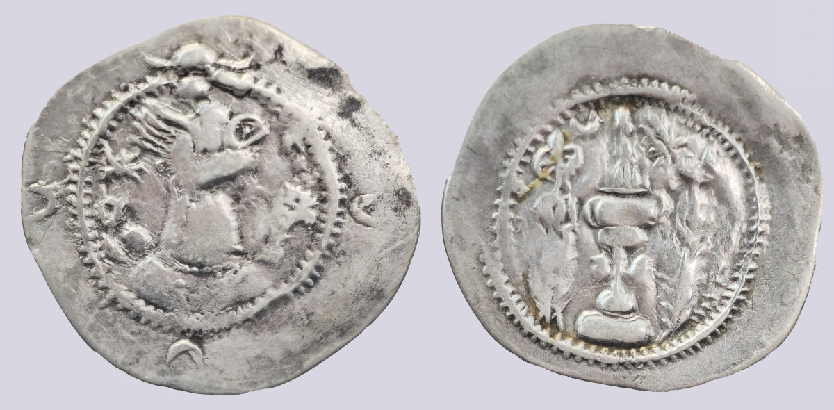 Based on the standard drachm of the Sasanian king Khusro I (531 – 579AD), but with bull’s head above the king’s crown